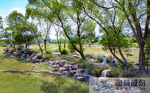 旁邊的一個(gè)樹島,用柴火和鋼管做出“鳥巢”形狀,雖稍顯“凌亂”,但卻顯得分外自然;再前方的一個(gè)樹島,增加“五指”塑石景觀,遠(yuǎn)遠(yuǎn)看去,好像一只大手托舉著大樹;穿過田間小路,來到幾棵大樹組成的樹林,錯(cuò)落有致的景石形成一個(gè)自然的圍合空間,林間小路用舊木頭鋪成,道路兩邊用紫色鼠尾草、刀茅等植物巧妙搭配出清新的花境,坐在樹下的石頭上小憩,看著孩子們在追逐嬉戲,仿佛回到了兒時(shí)和小伙伴在村口大樹下游玩打鬧的時(shí)光,關(guān)于故鄉(xiāng)的回憶充盈在心間。