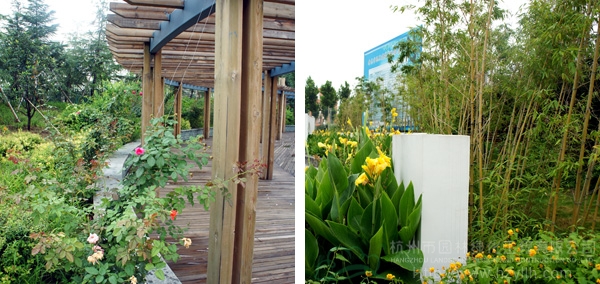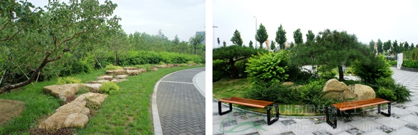 每個景觀節點上,植物的配置方法都是不一樣的,如在下沉廣場,主要是以小龍柏、金葉女貞等小灌木片植成方形或弧形,間或點綴石楠、梅樹,看起來規整、簡潔;而在設計風格為江南園林的南廣場上,是將貴重的造型油松單植,通過不同的組合,形成三個風格相近的綠島,周邊種植美人蕉、玉簪、竹子,并砌起白墻,上面開圓形拱門或圓窗,散發出詩意江南的靜謐和婉約氣息。“游憩步道是貫穿整個景觀的軸線,為了形成曲徑通幽的景觀效果,我們將對植、孤植、叢植都多種方法結合運用,特別是在三叉路口,多種植海棠、櫻花、杏花等,一方面,花開的時候,綠葉間繁花點點,會吸引人們不斷向前探尋更多的美景;而花落之后,茂密的枝葉又形成隱隱約約的視覺感受,前方轉過彎后風景什么樣,又讓人很想去看看。”高經理笑著說。