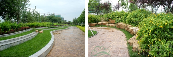 為了配合每個景觀節點的風格,園路的鋪裝材料和手法各不相同。據高經理介紹,工程中用到的鋪裝材料主要有汀布石、印花地坪、文化石、青磚、荷蘭磚、花崗巖等,其中,印花地坪是一種新型的鋪裝材料。“印花地坪主要用在北廣場上,其工藝為:在混凝土上面灑上特殊的配料,整平之后,再用模具一塊一塊壓出形狀,最后用特殊的膠水封膜,這種施工方法工藝新穎,花樣和顏色比較多,雖然工藝較為復雜,但是景觀效果非常好,遠遠看去,就如盛開在腳下的‘花海’,一路迤邐而去。”高經理說,“其他的鋪裝材料雖然比較常見,但我們在鋪裝工藝上進行了創新,如在下沉廣場的廊架旁,我們用黑色的鵝卵石與芝麻灰的花崗巖搭配,鋪出來的路面呈現出立體感,這種鋪裝工藝是借鑒了室內裝飾的手法,通過改造,用于室外鋪裝,遠遠看去,就像一級一級的臺階,帶動了周圍的景觀也動起來。”