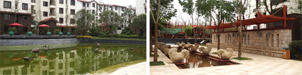 在紫荊東郡小區(qū),水景隨處可見,從主入口兩側(cè)近50米的景觀橋水景,到入口正前方一個(gè)大型的石雕噴泉,再到小區(qū)里面幾條主干道交匯的十字路口的小型地面噴泉,中心水景上的圓形石雕噴泉,特別是不遠(yuǎn)處的動(dòng)物噴泉雕塑,只只鶴低頭凝思,細(xì)長的水流從鼻端的出水口處流出,落入下方的水池里,更是格外引人注目。“這些水景小品具有的藝術(shù)特性與審美效果,加強(qiáng)了整個(gè)景觀環(huán)境的藝術(shù)氛圍,成為讓空間環(huán)境生動(dòng)起來的關(guān)鍵因素,在提高小區(qū)藝術(shù)品質(zhì)和景觀形象的同時(shí),更給人們帶來美的享受。”楊經(jīng)理如是說。