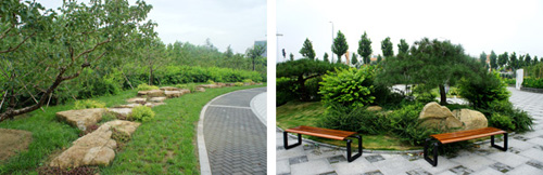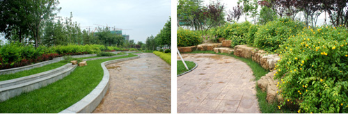而在道路十字路口的節(jié)點(diǎn)處,則主要是用10cm×10cm的小花崗巖鋪地,鋪出來的路面整潔、平坦,看似簡單,實(shí)則對施工技術(shù)要求相當(dāng)高。草坪中的地面鋪裝,則采用花崗巖汀步,用錯縫鋪裝法,兩塊花崗巖之間用草皮鑲嵌,就像給每塊花崗巖鑲了一道綠邊,與旁邊的草坪和諧地融為一體。貫穿整個工程的游憩步道,全部采用“人字形”的鋪裝方法,中間用透水磚、兩邊以花崗巖鑲邊,透水磚價格不高,用以鑲邊的花崗巖是利用了鋪裝中剩余的邊料,雖然用料簡單,但通過對技術(shù)的嚴(yán)格要求,鋪出的路面卻整潔而不失韻味,是一種實(shí)用、環(huán)保、節(jié)約的做法。