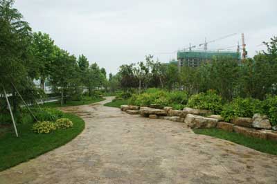 此外,工程中還用到了很多的景觀石,據高經理介紹,這些產自山東的龜紋石,質地堅硬,表面紋路獨特,主要用于上、下層苗木之間的過渡,相鄰景觀節點的分隔處,以及草坪中的點綴等。這些看似隨意但卻自然、和諧的景石擺放,讓生活在都市里的人們感受到了山之秀美、林之繁茂,就像一首無言的詩,一幅立體的畫,和著自然的旋律“輕歌曼舞”。
