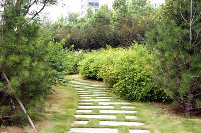每個景觀節點上,植物的配置方法都是不一樣的,如在下沉廣場,主要是以小龍柏、金葉女貞等小灌木片植成方形或弧形,間或點綴石楠、梅樹,看起來規整、簡潔;而在設計風格為江南園林的南廣場上,是將貴重的造型油松單植,通過不同的組合,形成三個風格相近的綠島,周邊種植美人蕉、玉簪、竹子,并砌起白墻,上面開圓形拱門或圓窗,散發出詩意江南的靜謐和婉約氣息。“游憩步道是貫穿整個景觀的軸線,為了形成曲徑通幽的景觀效果,我們將對植、孤植、叢植都多種方法結合運用,特別是在三叉路口,多種植海棠、櫻花、杏花等,一方面,花開的時候,綠葉間繁花點點,會吸引人們不斷向前探尋更多的美景;而花落之后,茂密的枝葉又形成隱隱約約的視覺感受,前方轉過彎后風景什么樣,又讓人很想去看看。”高經理笑著說。