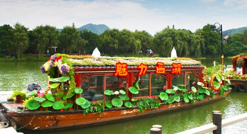藝術節期間,首次在西湖湖面上配置的6艘荷花花船,極大地提高了荷花節的觀賞性和趣味性,成為西湖中一道流動的荷花美景。其中,由杭州市園林綠化股份有限公司設計制作的“魅力西湖”荷花游船,將插花技藝與園林布景手法有機結合,用康乃馨、勿忘我、太陽花等與荷花組景,既突顯了“主角”荷花的秀麗、典雅,又使整艘船的色彩明艷豐富,將熱鬧的節日氛圍巧妙烘托。