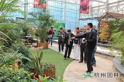 第二天,考察團在杭州市園林綠化股份有限公司總裁張炎良、副總裁丁旭升的陪同下參觀了畫境·青山湖花園中心。該花園中心是一個集園藝產品研發、展示和推廣的現代園林高新技術平臺,致力于打造庭院設計、咨詢、建造、養護等各類功能綜合的一站式園藝服務中心。項目有近3000畝配套生產基地,12000平米研發與生產溫室,以及室內情景展示區、園藝展示區,室外陳列展示區、應用展示區等多個功能區塊。其中,用于室內園藝展示的4000平方米的展覽溫室,引進荷蘭PRINS溫室技術,實現對溫度、光照等全智能控制,是一個技術含量極高的節能、環保型現代溫室。