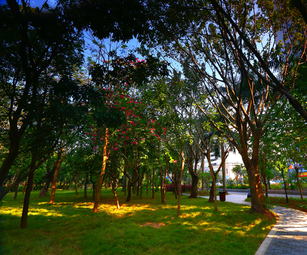 路旁綠地保留了2800多株冠幅茂密的原有喬木,根據地形又增加了不同規格的小葉榕、藍花楹、鳳凰木、宮粉紫荊、雞蛋花等喬木,小葉紫薇、丹桂、四季桂、大紅花等灌木,以及勒杜鵑、三色堇、紅車、巴西鳶尾、花葉良姜、巴西野牡丹等地被和草花植物,形成豐富的植物群落。臨近道路的邊緣則片植紅花夾竹桃、紅花羊蹄甲等做背景,下層列植尖葉木犀欖等常綠灌木,形成繁花似錦的熱鬧景觀。