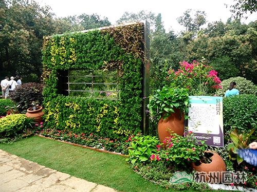 走進畫境園,只見主入口左側種植著兩株一高一矮的厚皮香樹,郭昌如笑著說,“這兩棵厚皮香寓意的是兩個萬分自豪的森林衛士——熊大和熊二,你看,熊二還滿臉熱情地向游人不停地招手示意呢?!敝魅肟谟覀仁且幻媪Ⅲw綠植墻,所用的植物主要為黃金絡石、金寶石冬青、小葉梔子花、金邊黃楊等。“立體綠植墻是立體綠化的主要形式,畫境?青山湖花園中心推出的這款立體綠植墻產品,可以根據客戶需要,結合氣候、溫度、濕度、色彩等綜合條件,選配四季長綠或色彩豐富的植物,隨時在人們想要的地方構建出一個貼近自然又超脫自然的生活環境,可謂是簡單又方便?!惫缃榻B道。立體綠墻的兩側,隨意地散落著一些紅陶罐,與金寶石冬青、龜甲冬青等精品球形植物,三角梅、月季、常春花、雞冠花等花卉,紫葉狼尾草、晨光芒、矮蒲葦等觀賞草混搭,營造出一種溫暖、和煦的庭院景觀?!叭绻丫G植墻看成是城市的建筑,此景則喻意美麗杭城的繁華一角?!惫缪a充說。綠植墻的中間還別出心裁地設置了一扇窗戶,透過它,園內的美景已隱約可見。