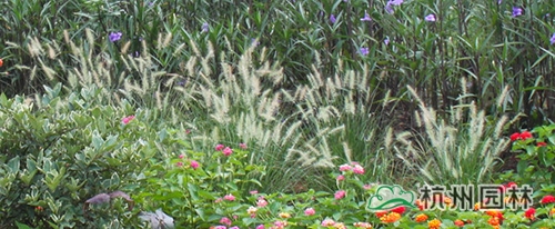 人來人往的杭州火車東站西廣場,草坪碧綠,樹木蔥郁,更有一座名為“西湖印象”的立體花壇吸引著眾多游客的眼。而在廣場通往天城路方向的一片草坪里,一處100平方米左右的花境小品卻格外引人注目,紅黃粉交相輝映的五色梅、葉秀花艷的香彩雀、紫色優雅的翠蘆莉、飄逸秀氣的小兔子狼尾草、青翠挺立的直立冬青、葉色嫩黃的黃金香柳……豐富的品種,艷麗的色彩,既展現出植物的色彩美,又營造出豐富的群落美,使得這處小花境成為這片風景的點晴之筆。