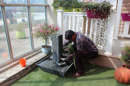 這個流水小品周圍可配置豎向線條植物,德國鳶尾、礬根營造水邊環境,以一高一低2棵直立冬青為背景,映山紅杜鵑滿樹紅花為該小景增添了色彩。還可以用花葉玉蟬花、常綠萱草、火星花等營造溪流氛圍。