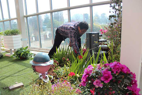 ▲我們選擇園藝中心室內一處小木屋的陽臺,作為造景點。園藝師現場查勘后,初步確定花境布置點的面積和風格。