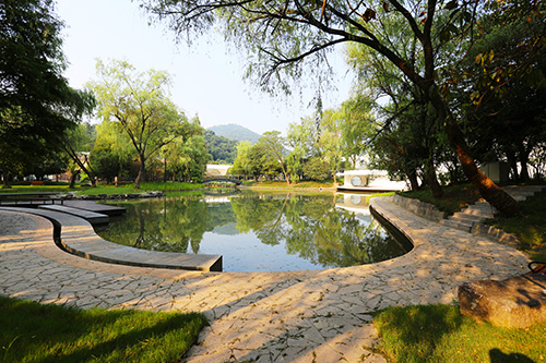 項(xiàng)目位于西湖區(qū)文一西路1000號(hào),走在校園內(nèi),入目所及,豐富的植物組團(tuán)與景石搭配的小景清新而自然;蜿蜒的園路旁,青青翠竹營造出幽靜的意境;溪水邊,古樸的亭子靜靜佇立成一道風(fēng)景,柳楊依依,花兒綻放,植物的倒影在水中清晰如畫,一幅婉約的江南水景圖徐徐展現(xiàn)在眼前。