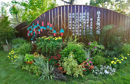 《絲?路》:“壯志西行追古蹤,孤煙大漠夕陽中。駝鈴古道絲綢路,胡馬猶聞唐漢風。”昔日西域古道的繁華猶在眼前,通過“絲?路”花境的營造,重走絲綢之路,感受不同時代的變化,寓意在新時期全面推動絲綢之路經濟帶的過程中,我們要以史為鑒,傳承絲綢文化,走好新絲路。