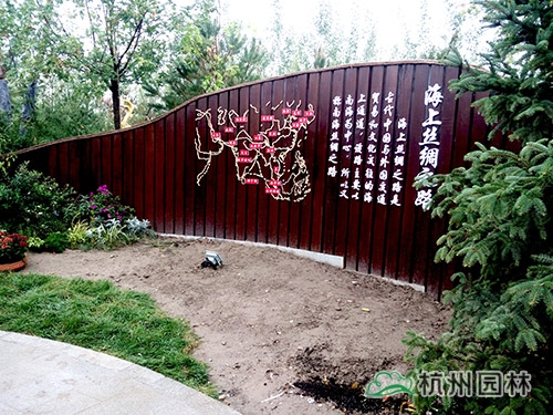浙江園入口平臺,往右側走,景墻剛好成為水系與黑松的夾景,入目處,陸上絲綢之路地圖及文字在暗褐色的木制景墻襯托下,格外醒目,花車更是極好地呼應了景墻地圖?;ň尘源藶榍腥朦c,確定了3組最高點,分別為花車處、文字右側及花車左側轉角處,分別采用紅楓及觀賞草白穗狼尾草作為視覺高點,其他植物色彩以暗色調為主,烘托景墻圖案及整體曲線感,花境中層適當點綴一兩株亮色調植物,增加花境的趣味性;下層則采用色彩鮮艷的植物材料,提升花境色彩的層次感。
