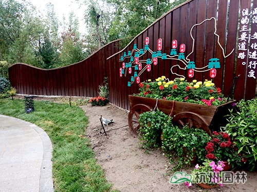本處已有木制景墻做背景,花境施工前已在幾個節點放置了花車、木桶等,并栽植了一棵較高大的紅皮云杉,為花境營造創造了良好的條件。結合景墻上的文字、地圖,以“陸上絲綢之路”文字為分界點,營造“絲?路”、“絲?念”兩組花境。