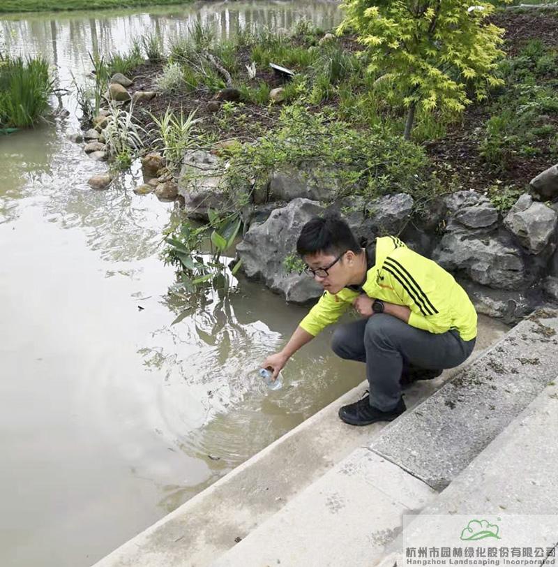 研發中心副主任高凱在浙江園取水樣測PH