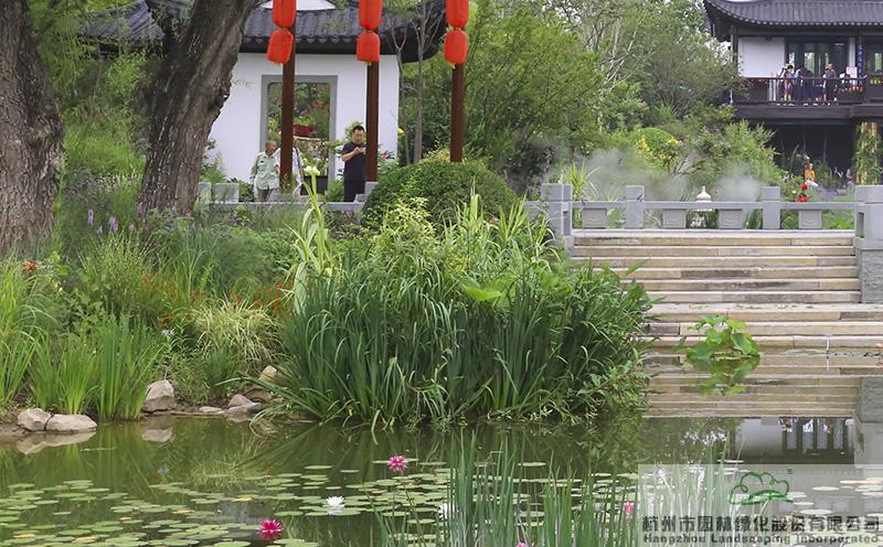 位于展園北側湖面上的新型生態浮島,采用框架結構與木本植物相結合的漂浮花壇技術,在浮力大的新型高分子材料浮槽上鋪設種植基質,配置厚皮香、芒草、千屈菜、再力花、梭魚草、旱傘草、美人蕉等植物,形成優美的水上景觀。并結合岸邊和水中的旱柳、千屈菜、黃花鳶尾、水蔥、香蒲、菖蒲、蘆葦、荷花等水濕生植物,營造出豐富多變的湖面景觀,同時起到凈化水體的生態環保效果。