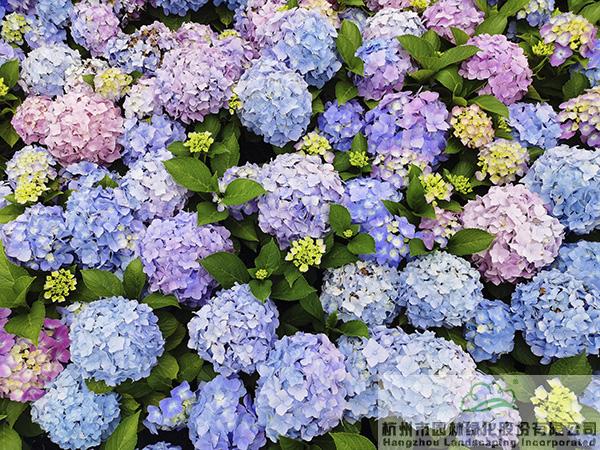繡球最大的魅力就在于它的花色豐富,顏色可調(diào)。從初開時的清澀嬌嫩,半開時的含羞欲語,到全開時的繽紛絢麗,在花開的不同階段,繡球的花色都有細(xì)微的區(qū)別。而紅、粉、藍(lán)、綠、紫等豐富的色彩,更是使繡球花顯得千變?nèi)f化,同一盆,甚至同一朵花上,花色都會有不同變化。隨著土壤酸堿度的不同,繡球的花色則會在粉與藍(lán)、紅與紫等之間不斷變化,增添了更多的觀賞趣味。遠(yuǎn)遠(yuǎn)望去,一大片不同品種的繡球花,宛如打翻了的調(diào)色盤,鋪展開一幅色彩斑斕的夏日畫卷。