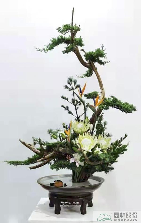 另有極富意境的《云崖青嶠》插花作品,選崖柏、龍柏、鋪地柏、五針松、帝皇花、重瓣百合花、粉色和白色金絲桃、天堂鳥,以成云崖青嶠之作。云為雅意,崖寓故訓,青色入觀,嶠在畫外。如此,松風若過,花開舒卷,青紅果結,臨水照影。清澗之曲,碧松之陰,相映成趣,著手成春矣。