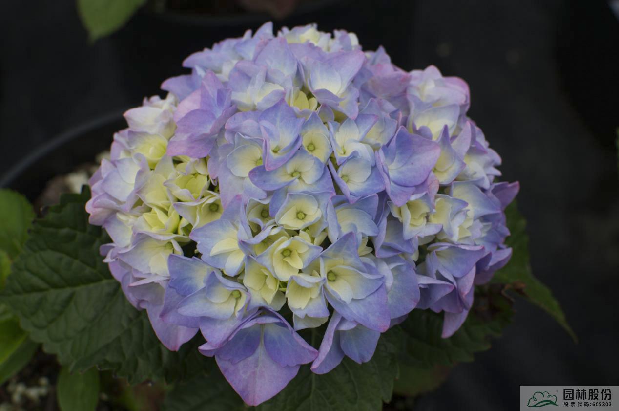 大葉繡球品種間雜交品種;葉片寬卵形,中綠色;近球狀花,花型較大,萼片(花瓣)具有內彎的特點;花色以藍紫色為主。盛花期的棉花糖,像是一個個小喇叭組合成球,特別萌系可愛。杭州5月上旬開花,可延續至6月下旬。