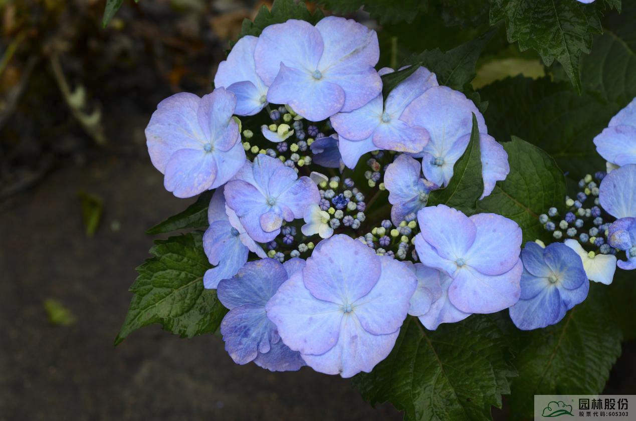 大葉繡球品種間雜交品種;葉片卵形,中綠色;盤狀花,萼片(花瓣)巨大,花色為深紫粉色至鮮紫藍色,添加調藍劑時可變為深紫藍色。花開時,宛如一只只蝴蝶在枝頭翩躚,靈動多姿。杭州5月上旬開花,可延續至6月下旬。