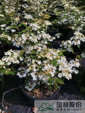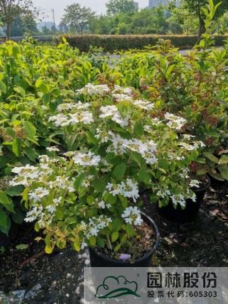 忍冬科莢蒾屬,落葉灌木,株高可達1.8m,植株緊湊飄逸。春季新葉邊緣具紅色紋。聚傘花序白色,開于枝頂,外圍為一圈不孕花,可孕花位于中間,是目前國內現有的莢蒾品種中花期最長的一個,可從春季開始一直開到秋季,盛花通常4月中旬至5月中旬。冬季至早春可修剪。一年施肥3次,早春萌芽前,盛花期后及秋季。分枝能力強,適合園藝盆栽或庭院觀賞。