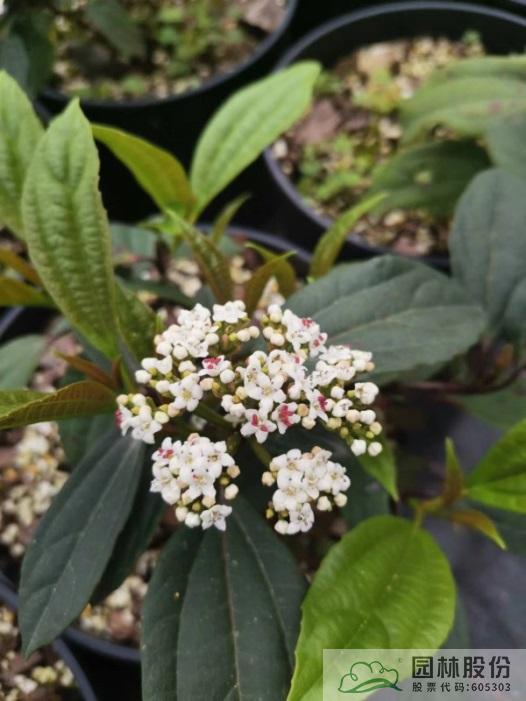 忍冬科莢蒾屬,落葉灌木。進口品種,植株直立性強,分枝多,枝條較纖細。花為蝶形花,可孕花周圍圍繞一圈不孕花。花量大,隨著時間的推移,花色由綠色轉為白色,最后呈粉色。果實鮮紅色,觀果期長,大量鮮紅的果實挺于葉面之上,頗有豐收之象,為莢蒾屬中粉色系為數不多的品種之一,適合園藝盆栽或庭院觀賞。