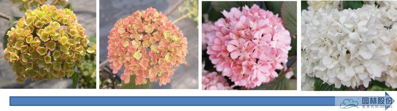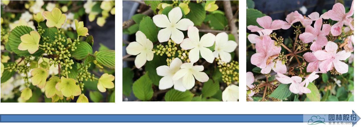 忍冬科莢蒾屬,落葉灌木,日本引進,株高可達2.5-3m。新葉成暗紅色,后呈綠色,秋色葉顏色多變。整個花序都是不育花,球形,花苞粉綠色,開放后淡粉色,最后變成白色。它適應我國大部分地區種植,生長相對緩慢,適合園藝盆栽或庭院觀賞。
