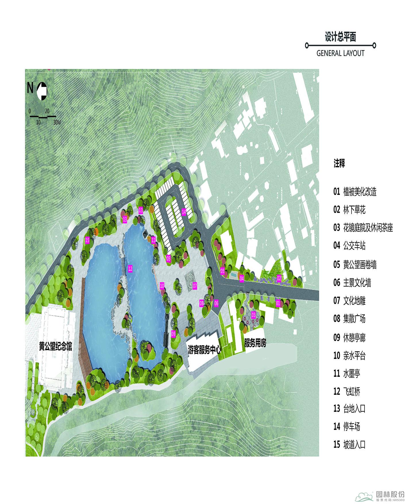 項目位于黃公望隱居地入口,環境清幽,具有極好的生態條件。入口區有黃公望紀念館和接待中心兩處主要功能區,其間有竹林碧譚鑲嵌其中。