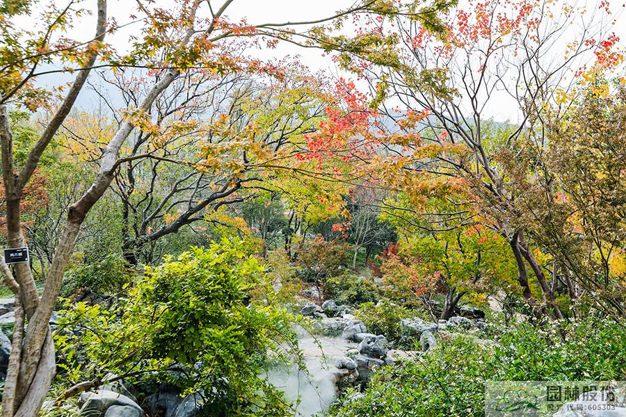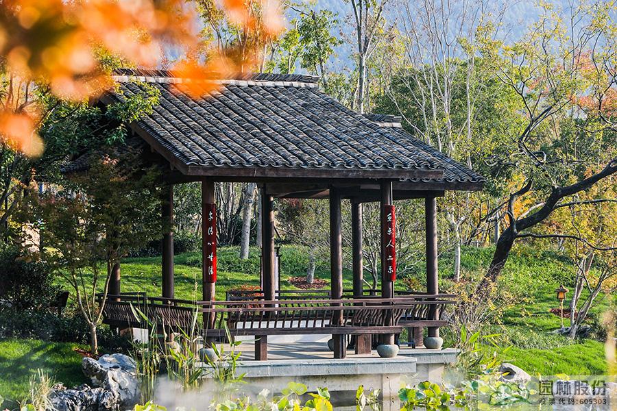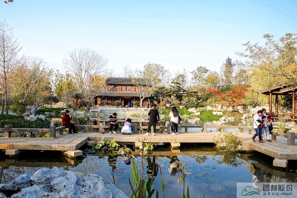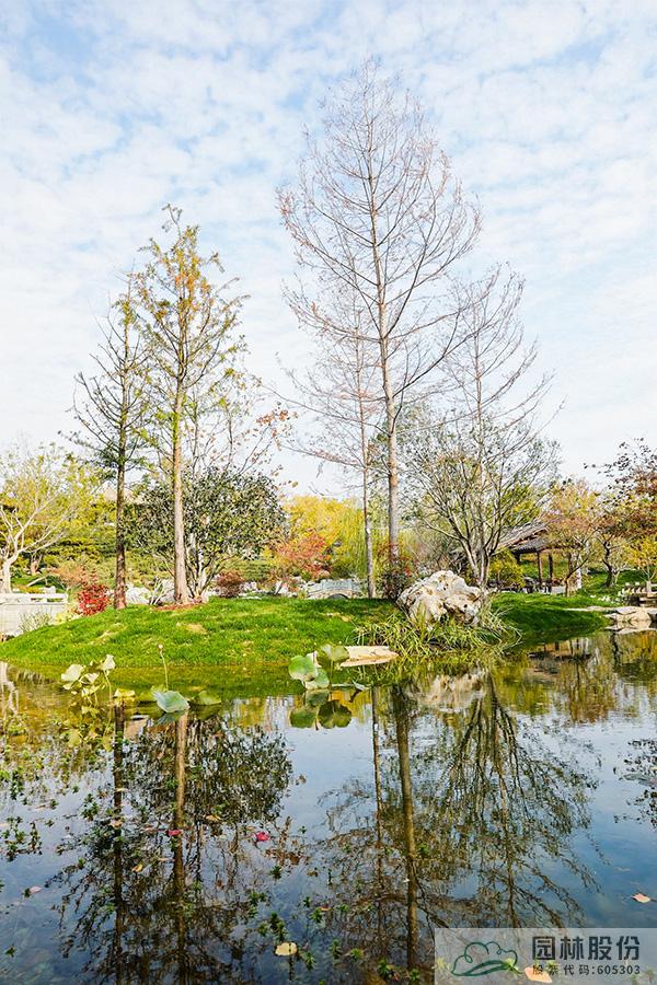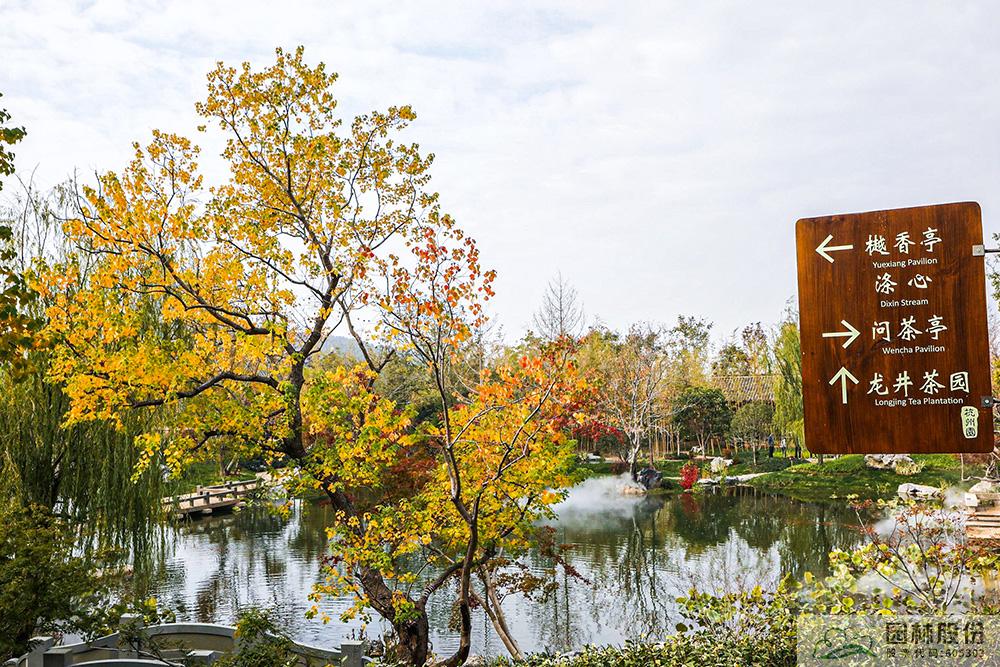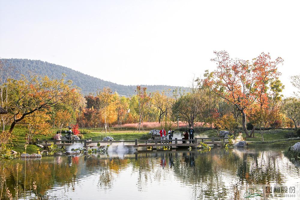 契合展區(qū)主題的樾香亭臨湖而立,雙坡屋面,八柱敞亭,柱子上書五言聯(lián)“魚樂人亦樂,泉清心共清”,盡顯悠閑舒適的情趣。在亭內(nèi)憑欄而坐,側(cè)耳聽風雨,迎風嗅花香。抬頭遠望,荷葉亭亭的水面上,有魚兒在水中嬉戲;曲折的長橋上,游人在漫步觀景;水岸邊,銀杏、三角楓、烏桕等色彩繽紛,編織出一幅深秋的美麗畫卷。