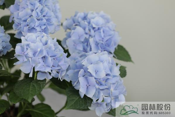 落葉直立灌木,高約0.40~0.50 m,莖圓柱形,綠色,皮孔數量中,為紅色,節間長度8.5~9.4 cm,被毛,莖節處無花青素著色;葉片長11.3~11.7 cm,寬6.4~6.8 cm,無裂,卵形,葉尖長,基部圓形,鋸齒深,鋸齒密度中等,中綠,上表面光澤度中,泡狀程度強,無毛,葉柄無花青素色著色;傘房狀聚傘花序盤狀,高度4.2~4.6cm,直徑12.2~16.8 cm,可孕花中等明顯;不孕花1輪排列,萼片1輪,4~5枚,擴卵形,直徑5.2~5.8 cm,平展,泡狀程度強,中等重疊,邊緣部分具淺缺刻,萼片主色為淡紫色,邊緣為白色;可孕花花瓣為亮紫藍色;杭州花期5月上旬至7月中旬。