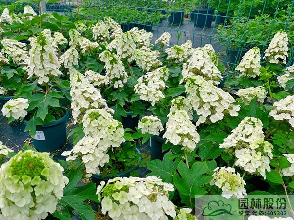 虎耳草科繡球?qū)?,落葉灌木;成株高度100-150 cm,成株冠幅 80-150 cm;葉片掌狀,長(zhǎng)寬接近,3~7 裂;花期6-10 月,圓錐花序,花朵密集型,盛花時(shí)碩大醒目的花序可達(dá) 30 cm 以上,初期翠綠色,中后期花色逐漸轉(zhuǎn)白,秋季晝夜溫差大會(huì)使其逐漸暈染上粉紅色;老枝開(kāi)花,成年植株花期觀(guān)賞效果極佳,花后修剪,平時(shí)只需修剪重疊枝、病殘枝即可,以免影響第二年開(kāi)花;耐熱耐寒,喜溫暖和偏蔭蔽的環(huán)境,微酸性土壤;株型高大,枝條挺拔,樹(shù)冠寬闊豐滿(mǎn),花球碩大;櫟樹(shù)一樣的掌狀葉片,到秋季會(huì)轉(zhuǎn)變?yōu)樯罴t色,紅葉期一般從每年的深秋至次年的5月,是一種既可觀(guān)花、又可賞葉的彩葉灌木。