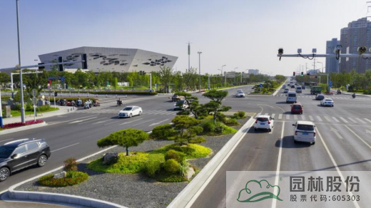 打破原有道路植物種植形式單一,品種較少,冬季落葉草本花卉較多,與道路西側景觀難以呼應的不足,改造后的中央隔離帶,在道路兩端島頭位置,用國產造型黑松替代性價比不高的日本造型黑松,以造型黑松樁點綴,中間段則采用常綠植物和自然式花境,以大小組團形式進行植物造景,在豐富植物品種和種植手法的同時,滿足了冬季景觀效果,并能與道路西側景觀有機融合。
