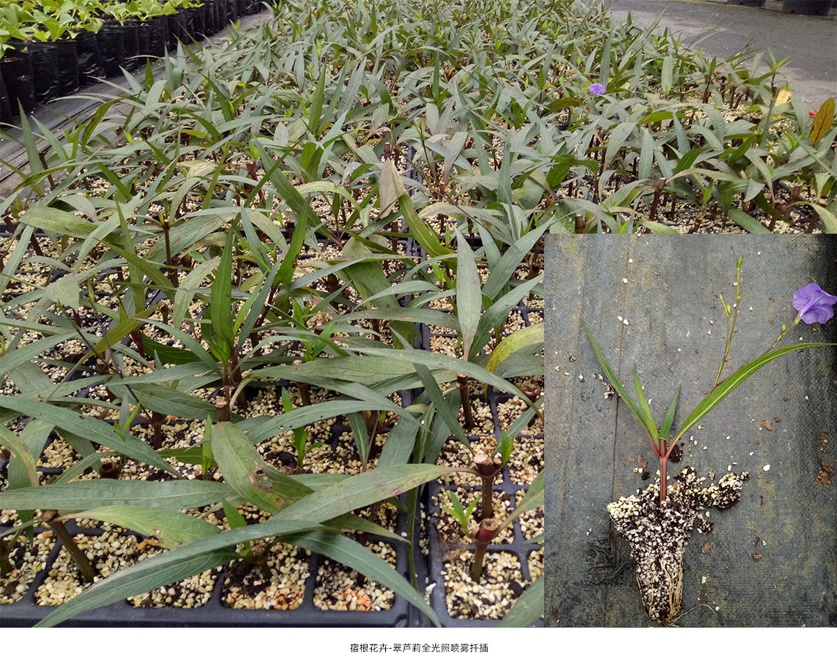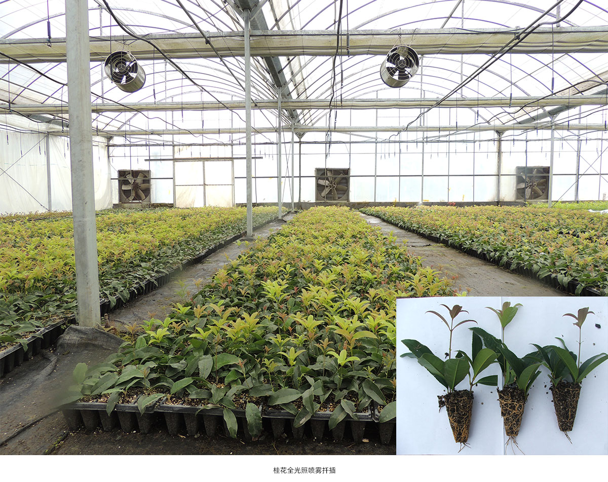 全光照噴霧扦插技術具有生根期短、成活率高和操作簡單等優點。研究院已建立了桂花、冬青、降香黃檀、新優宿根植物等數百種植物的全光照噴霧扦插技術體系,年度育苗量200多萬。
